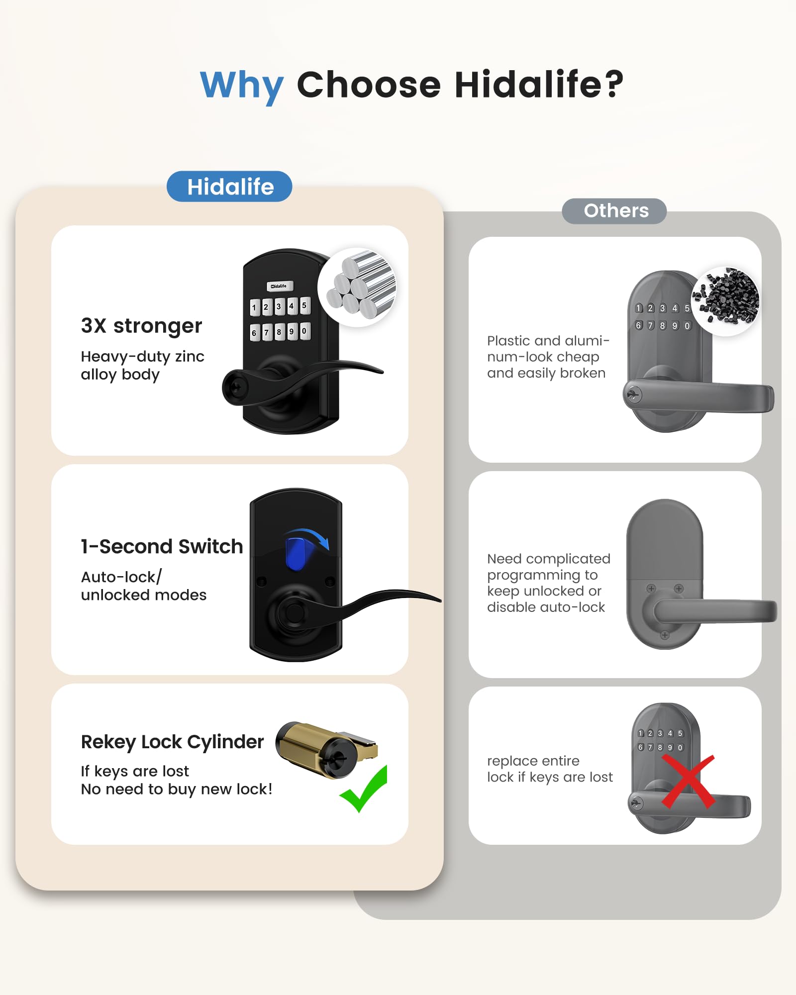 Hidalife Keypad Door Lock with Handle, Keyless Entry for Front Door, Manual Passage Mode, Matte Black