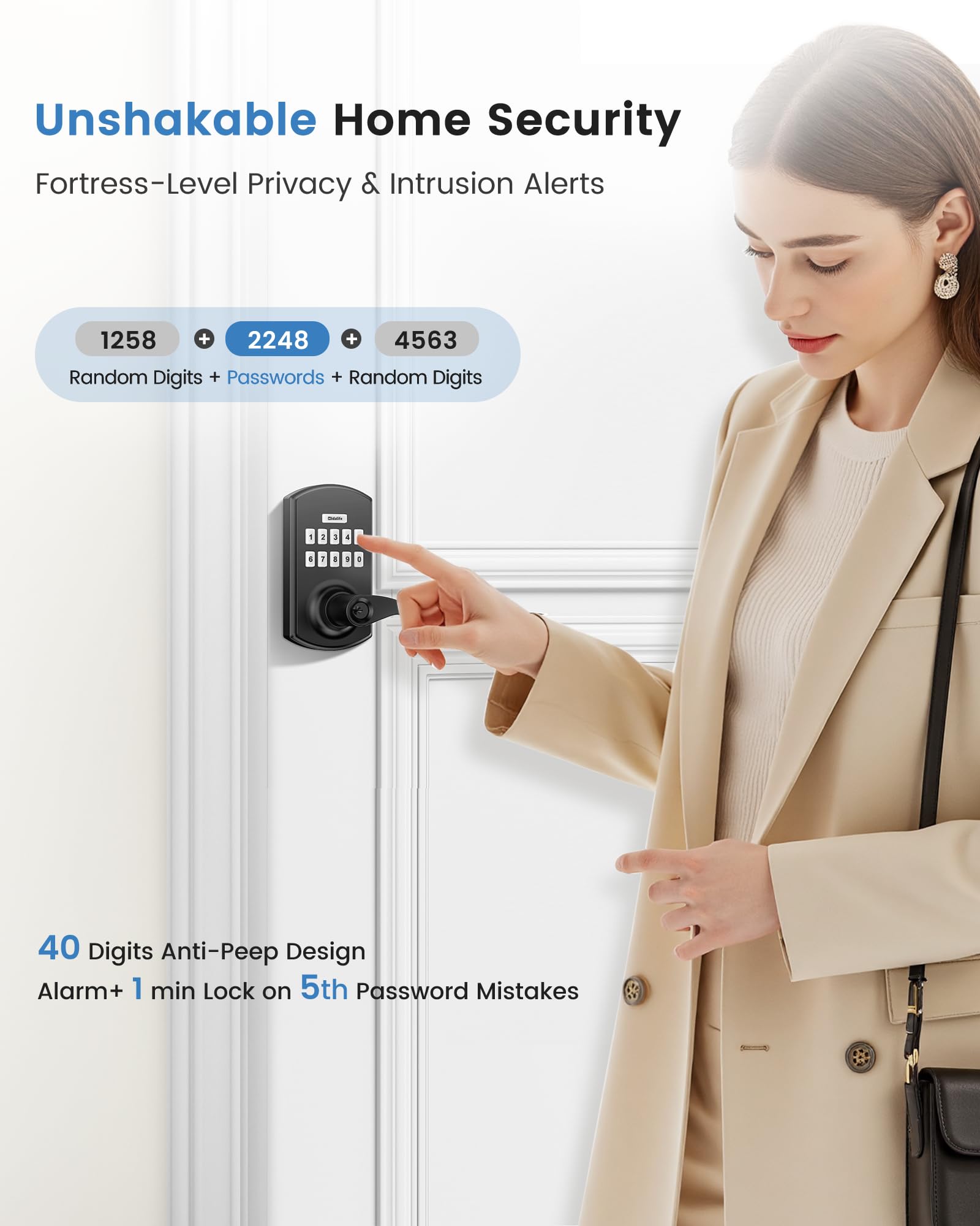 - Smart Anti-Peek Protection: This smart door lock features advanced anti-peek technology. Just add random numbers before/after your real code to fool intruders - the perfect keyless entry door lock for high-security needs